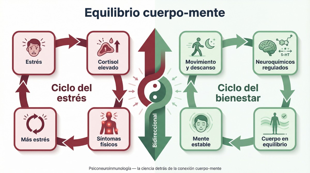 El equilibrio cuerpo-mente no aparece de la noche a la mañana, ni se consigue con un único hábito. Es el resultado de una relación bidireccional entre tu sistema nervioso, tu sistema inmune y tu estado emocional, tres ejes que se comunican de forma constante a través de vías biológicas muy concretas.